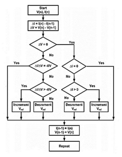 PV energy production is highly dependent on the number of factors, like sun irradiation and ambient temperature. PV modules contain unique maximum power points that are related to current solar irradiation and current weather temperature values, in addition to voltage and current relationships that are not linear. MPPT algorithms are used to get the current and maximum power from PV modules by controlling DC-DC converters and successfully regulating the obtained power and voltage values from PV modules under different situations. There are a lot of MPPT algorithms to choose from, however this paper focus on incremental conductance. Fig.3, illustrates the procedure of Incremental Conductance based MPPT. Incremental Conductance Technique as a MPPT algorithm [14-15]. The boost converter parameters are listed in table 1.