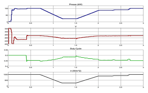 The operation scenario is done by exam the PV system performance under STC 1000W/m2 solar irradiance and 25oC temperature. After transient period the solar irradiance to 250W/m2 and the generated power from PV array 100kW. After that the solar irradiance increased gradually to reaches maximum value. Fig.4 shows the Simulink results obtained from grid connected PV system under different situations [18].