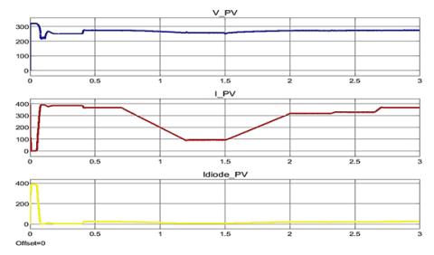 From the above Figure the maximum output power has been obtained at solar irradiance 1000W/m2 and the low output power (14kW) has been obtained at solar irradiance 250W/m2. The variation of duty cycle between 0.45 – 0.5. Fig.5 represents the variation of V.PV and I.PV as time variance with respect to Idiod-PV value. The low power was obtained at mid time scale (1.5sec).