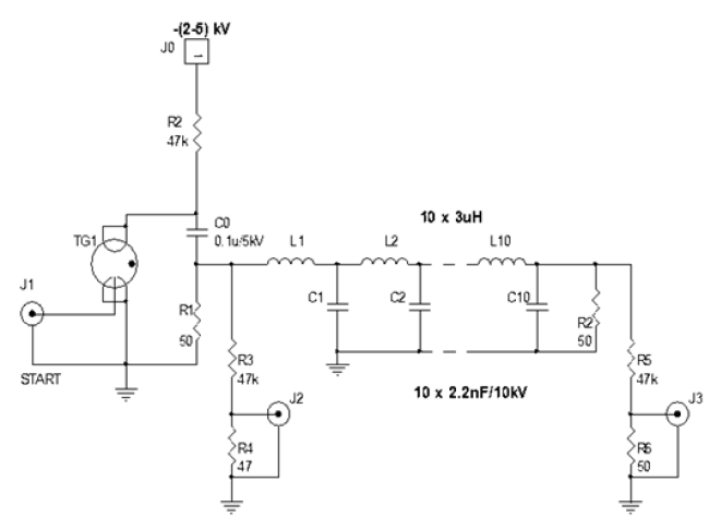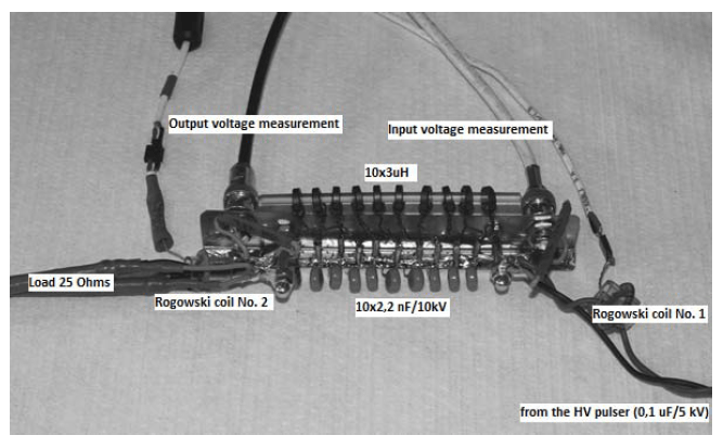 The high voltage pulse is applied to the line input when the TG1 controlled spark gap is triggered. The line input voltage was measured using divider R3/R4 with a division of 1000, the line output voltage was measured using divider R5/R6 with a division of 940. Measurements were carried out for capacitor C0 charging voltages between -3kV up to -6.5 kV. The view of the transmission line built and used in the study is shown in Figure 5.