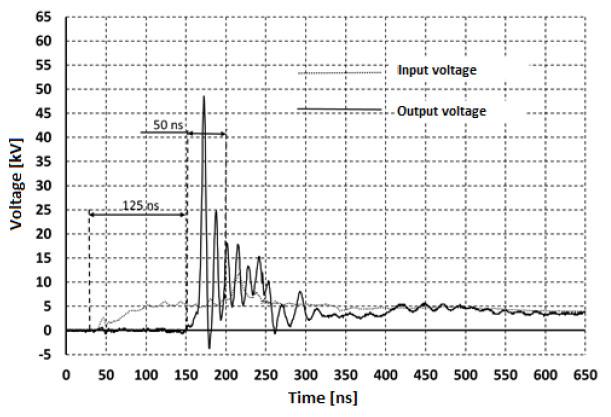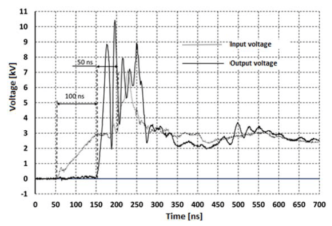 2. The amplitude of the solitonic output pulses was multiplied up to 9 times to 62 kV (Fig. 8), with their halfwidth of 6 ns.