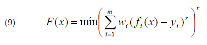 To write the aggregate form of the objective function, the distance function minimization methodology was adopted. The distance function method combines several criterion functions into a single aggregate based on a vector of (arbitrarily determined) ideal values. In this case, the optimal solution is the one that minimizes the distances between F(x) and the y vector.