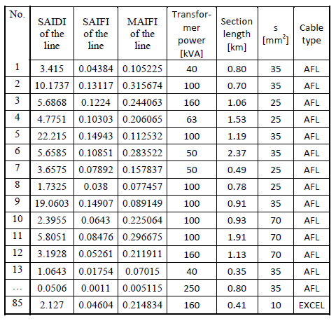 Table 3. Values of reliability indexes of MV line sections after modernization