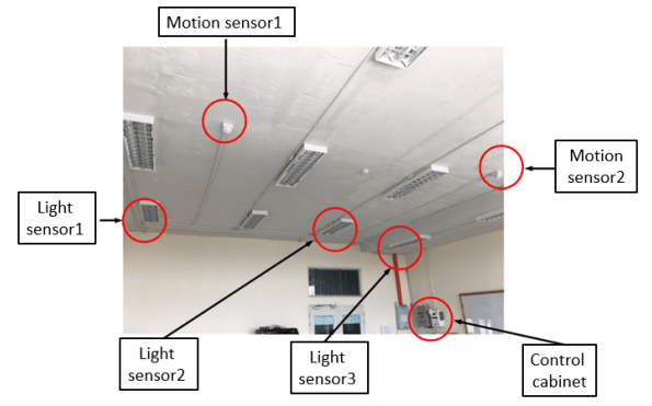 After the system design in Fig. 2, we developed the implementation of actual use. The system actually developed consists of two control cabinets as shown in Fig. 3. The cabinet A is a combination of three-phase power control system (number 1 in Fig. 2), including operating status display and manual control (number 3 in Fig. 2) in this cabinet. The cabinet B is a detector sensor system, processing and transmitting data to the cloud system. In addition, two motion detectors were installed on the ceiling of the office room, together with three light detectors in the office. The detectors were installed near the center lamp in each row of all three ones. Doing so is because each row can be switched on and off independently as shown in Fig. 4.