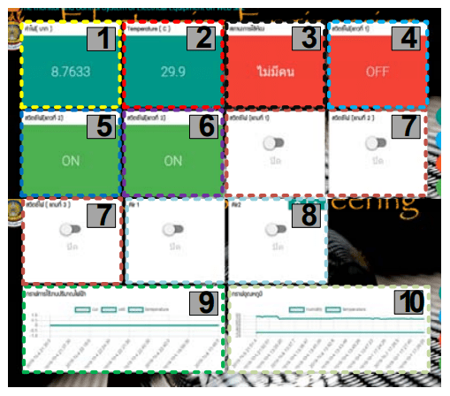 Fig. 5 presents the design of the webpage for the use status and the use control of equipment in the office room. The power consumption control is divided into 10 parts: 1) power charge indicator, 2) temperature indicator, 3) the use of office room, 4) lamp indicator in row 1, 5) lamp indicator in row 2, 6) lamp status indicator in row 3, 7) on/off control button of lamps in row 1 and 2, 8) on/off control button of air conditioner row 1 and 2, 9) electric quantity usage graph, and 10) room temperature graph.