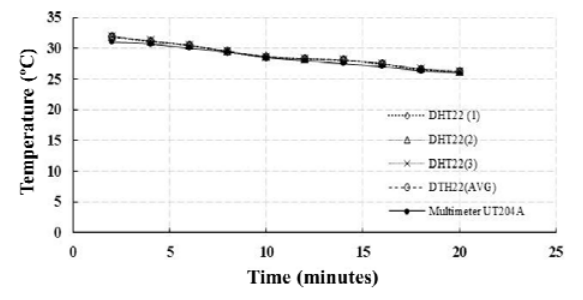 The temperature measurement in the office room started from turning off two air conditioners, then waited for two minutes before turned on both air conditioners. Temperature measurement was conducted every two minutes. The test results, indicate that the temperature measurements in 10 different office room had and an average error of 0.392 degrees Celsius as shown in Fig. 7.