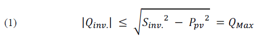 Where: 𝑆inv. is the rated power of the inverter, 𝑃pv is the instantaneous PV power of the PV Array, 𝑄inv. is the reactive power of the inverter, and QMAX is the reactive power limit of the inverter when supplying active power 𝑃pv [13].