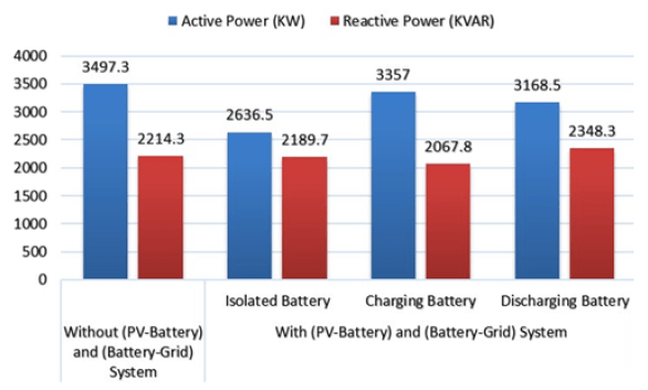 The voltage increased at the PCC when both the (PV-battery) systems injected reactive power into the electric power system. Even in battery isolation mode, the voltage increased at the PCC when the (battery-grid) system injected reactive power into the electric power system. Therefore, an injection of reactive power from a RES system to an electrical power system causes the voltage at the PCC and DC-Link to increase. Hence, the hybrid systems failed to achieve the correct isolation pattern for the battery.