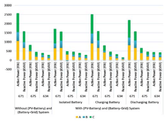 Connecting a RES system to the electrical power system effectively decreased the amount of electric power supplied from bus 632 to buses 671, 675, and 634, especially in battery isolation mode. The amount of active power supplied to the bus exceeded the amount of active power that the batteries contained in charging and discharging modes. Active power was supplied to buses 671 and 675 at a rate of 33.4% and 45%, respectively, in battery isolation mode with UPF in comparison to no RES systems. It is noteworthy that the active power flowed in reverse in phase B of bus 675 as the PV system generated more power than a common load required in battery isolation mode (Fig. 11.).