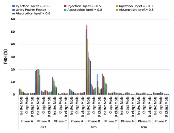 The largest distortion in the voltage wave (THD-V) occurred in battery isolation mode at UPF. Therefore, reactive power has a clear effect on this mode. As seen in Fig. 13., the THD-V of buses 671, 675 and 634 decreased in phases A, B, and C when reactive power was injected.