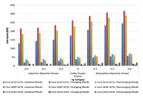 As seen in Fig. 15., the transmission lines linking buses 632-671, 692-675, and 633-634 experienced the highest losses in the battery charging mode. This occurred as, in this mode, most of the power generated from RES is used to charge the batteries. As such, the power flows within the transmission lines from the main power generation sources of an electrical power system to cover the load requirements of the buses. The injection of reactive power helped decrease the amount of active power losses when the amount of reactive current in transmission lines decreased but increased the amount of active power losses when reactive power absorption increased.
