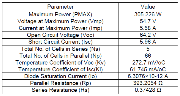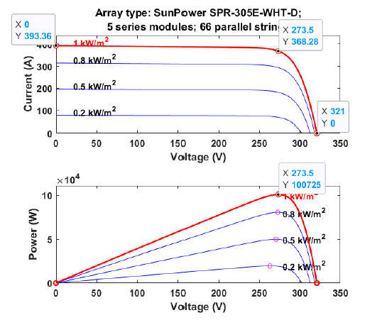 Two (PV-battery) systems were designed. The first system consisted of four parallelly connected PV arrays to generate 400 KW of active power while the second consisted of five parallelly connected PV arrays to generate 500 KW of active power. The PV arrays were module-type SunPower® SPR-305E-WHT-D (305W) solar panels that each generate 100 KW of electrical power. All the PV arrays were set to operate under standard test conditions (STC), which was 1000 W/m2 of solar radiation at 25°C.