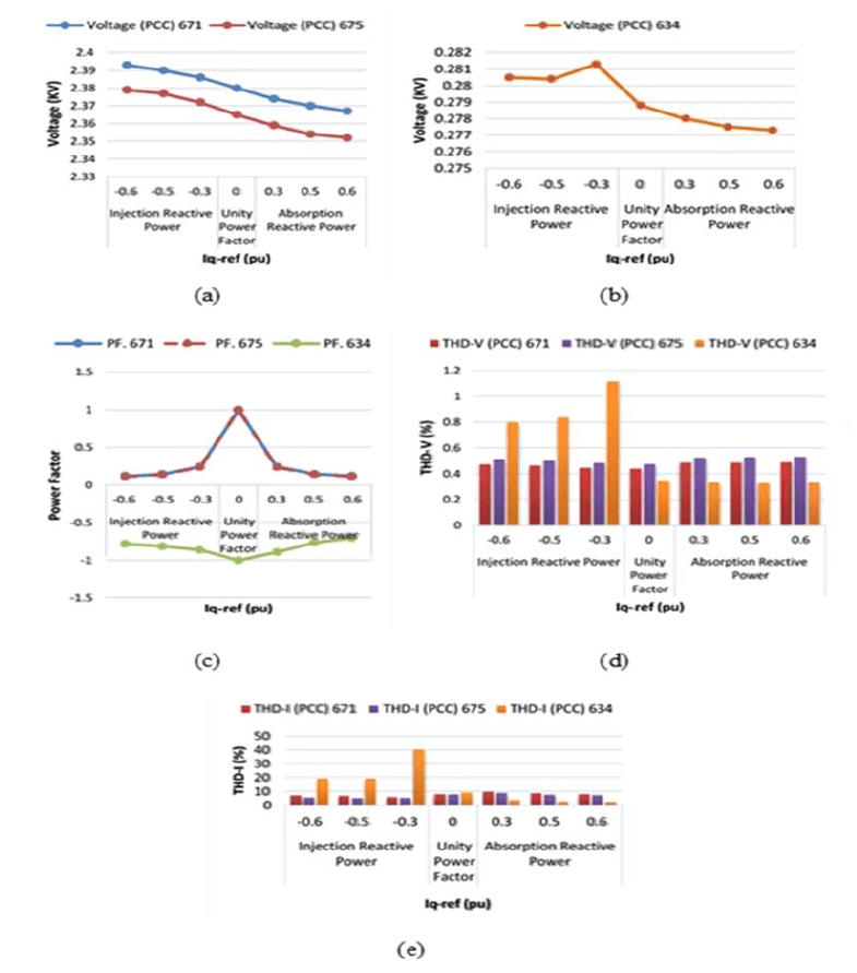 Absorbing reactive power from the electrical power system decreased the voltage and increased the THD-V at the PCC of the three buses. Meanwhile, the THD-I decreased at the PCC of bus 671 and decreased by 25.43% at the PCC of bus 634 but increased by 16.6% at the PCC of bus 675 when 238.43 KVAR of reactive power was absorbed.