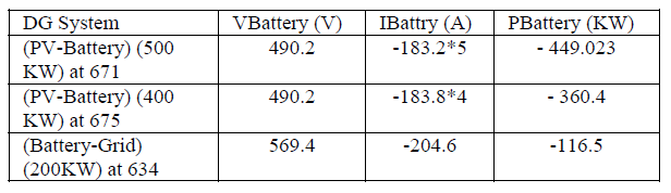This mode occurs in both the (PV-battery) systems when the SOC of the battery is 70% and the irradiance is 0%. Meanwhile, in the (battery-grid) system, this mode occurs when the normal operating load at bus 634 increases by 50% and the SOC of the battery is 75%. Table 5 shows the amount of power generated by the batteries in the battery discharging mode.