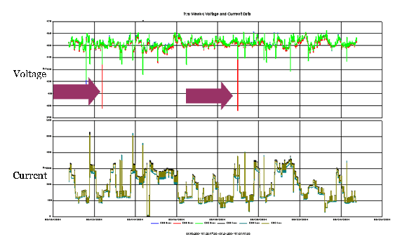 - The top graph shows the voltage, which averages about 450V as opposed to the 480V expected. This resulted in a continual undervoltage situation, putting the system at a higher susceptibility for sags.