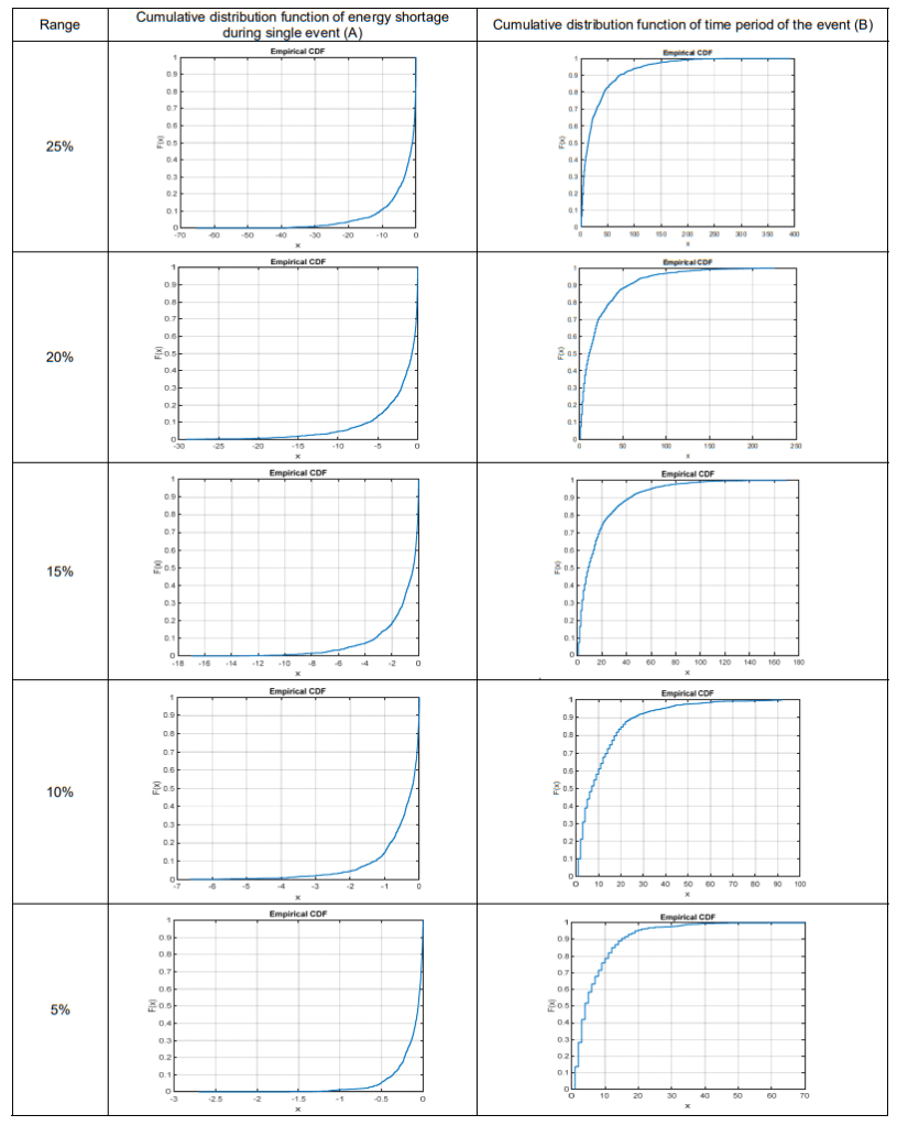 Table 2. Cumulative distribution functions of energy shortage and time period of the event. Range – arbitral level of windmill usage below with power system experiences energy shortage, axes at (A) column – X axle: energy shortage [h x installed windmill power], Y axle: probability of events for which the lack of energy was greater than the value determined on the X axis; axes at (B) column – X axle: time period of event in hours, Y axle: probability that the time length of a certain event is shorter than x value.