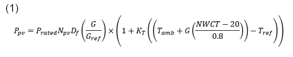 Where: PPV Produced power of photo voltaic (kW); Prated Output power of module (kW); NPV PV modules number; Df PV derating factor ; G Titled plane global utility fallen (kW/m2); Gref Solar radiation at base conditions (1 kW/m2); KT Temperature coefficient ; Tamb Ambient temperature (◦C); NWCT Normal working cell temperature