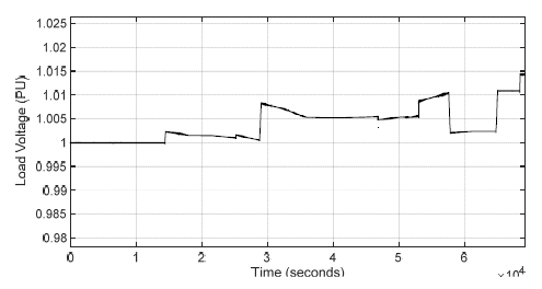 The supplied by three sources the main grid supply with 15 MW, and variable wind energy with maximum power of 4.5 MW as shown in Figure 6 and solar energy with 8 MW in time interval from 6 am to 18 pm as shown in Figure 7. The adaptive neuro-fuzzy controller programmed to give the priority for supply for wind and solar energies to decrease the supply from the grid this will decrease the fuel and then operate more economic. The proposed power management of the system algorithm is illustrated in Figure 8. The time calculated based on 24 hours (606024 sec). The real and reactive power demand of the load for 24 hours is shown in Figure 9, also the load voltage shown in Figure 10 respectively.