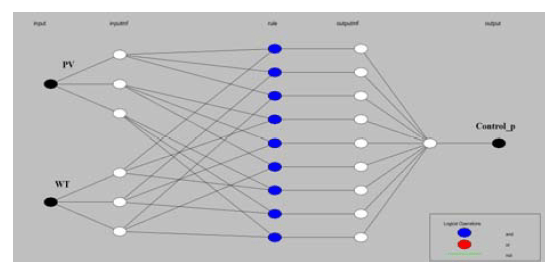 By using an artificial neural network (ANN) as a learning method, fuzzy rules are learned. Without the expert knowledge often necessary for the usual form of FCL, such control may be learned, and the rules base can be reduced. Training phases establish the input control parameters and output of membership functions (MF). The goal of the learning algorithm is to modify the input parameters and output MFs to get the optimal output alignment for the proposed controller [27]. The control parameters of a network are often identified using a hybrid learning technique called “Least Squares Estimate-LSE and Gradient Descent-GD” [28]. In the current study, the controller grid power’s two inputs were generated by solar and wind energy. Wind turbine power and PV power with one output for power load decision to the control unit of DG the structure as shown in Figure 5. Structure breaks the universe for discourse into three-triangle MFs with a 50% overlap, followed by controller inputs and control p controller generates “three inputs and one output”, with a control rule of 9 as a result, requiring the specification of linear functions. One piece of data must be produced in order to tweak the TS rules using neuro-fuzzy. The controller’s input data consists of data vectors with PV/WT results that follow Equations 1 and 2, with the controller’s output going to the DG control unit. Figure 6 depicts the control designer’s output validation surface. The MATLABGUI for neuro-fuzzy file contained in the toolbox of MATLAB/fuzzy is employed to carry out the training operation.
