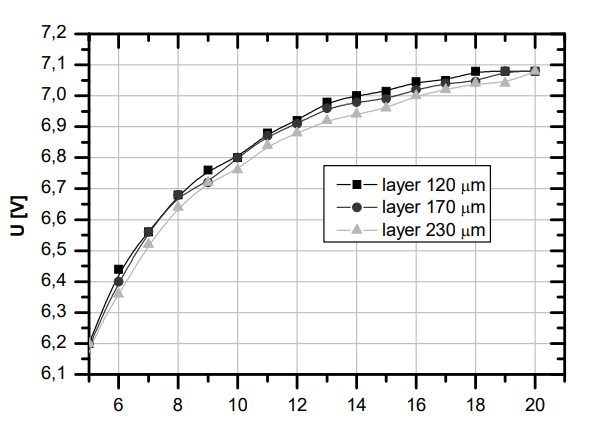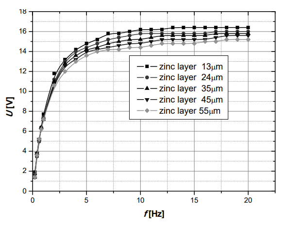 At the preliminary stage of the study, the total thickness of the protective coatings can be measured by means of the inductive method. The thickness of the conducting layer cannot be measured directly since it is located under the external protective non-conducting layer, such as paint. The zinc coating located under the paint layer can be measured by means of an inductive transformer sensor. To verify the usefulness of this method in the first stage of the study, test measurements on zinc coatings 13 µm, 24 µm, 35 µm, 45 µm and 55 µm thick on a 1mm thick ferromagnetic substrate were carried out. The external paint layer was selected in such a way that the joint thickness of both layers, i.e. the zinc one and the paint one was 70 µm. Because of that, the sensor does not respond to variation in the total thickness of the two-layer coating, which is constant, but to the variation in the zinc layer. Fig. 3 presents selected measurement results of the thickness of various zinc coatings.