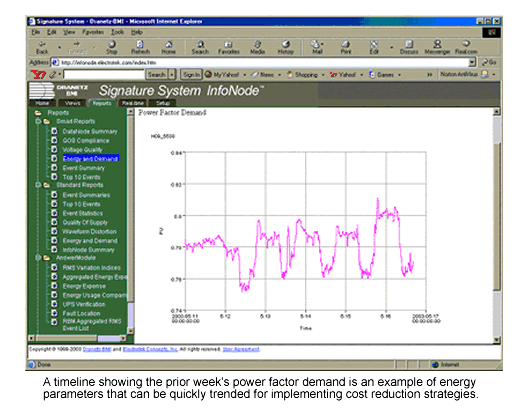 The cost of energy is one of the most commonly mismanaged expenses, regardless of a company’s size or the industry represented. Often, energy is purchased in one department, consumed in another, with energy management systems operated and maintained by still another. Since each facility’s energy situation is dynamic and interdependent, it requires continuous monitoring and management action to avoid escalating costs. The web-based Signature System™ enables users to continuously monitor and store power consumption and quality information in real time-to capture those savings and improve profitability. Customers use the System for: