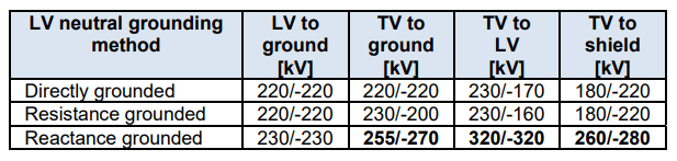 The transferred surge has usually both the capacitively and inductively transferred components which are superimposed on the power-frequency voltage. The capacitively transferred component is typically in the MHz range and is seen first in the transferred surge. The inductively transferred component is slower than the capacitive one and is seen later. Its shape and amplitude change in time, because the distribution of the voltage along the primary winding is time-dependent. The magnitude of the transferred voltages depends on the construction of the transformer, damping effect of the winding, capacitances of the transformer, winding turns (transformation), vector group, connection to the network, etc. In addition, the waveshape of the incoming surge has an important role [3, 8-11]. Often neglected factor is a neutral grounding method. Majority of RCTs are grounded through reactance with a purpose is to lower a ground fault current in the 34.5 kV system (typically single-phase underground cables), so that one can minimize the sizes of main conductors, concentric neutral and grounding wires in the collector system – those result in significant cost savings, as wind turbines can be up to 15 km away from a substation. Neutral Grounding Reactor (NGR) is typically easier to install and more durable than a neutral resistor. Typical NGR impedance is between 0.5-3.5 Ω. A presence of NGR in the neutral has impact on the transient response of a transformer. Grounding a transformer directly or with a resistor will result in lower internal overvoltages, than those appearing when an NGR is used. This characteristic – i.e., oscillatory response of a RCT grounded through reactance – was studied many times and typical results were presented at IEEE PES Transformers Committee [12]. The unit in this particular study was a 200 MVA windfarm collector transformer, 34.5Y-345Y kV with buried TV, with 1050/110 kV BIL HV and 200/200 kV BIL LV levels. The unit was analyzed for a transient response with LV neutral point: (i) grounded directly, (ii) grounded through resistance and (iii) grounded with reactance, NGR. The results on Chopped Wave application to LV terminals with different grounding methods are shown in Table 1.