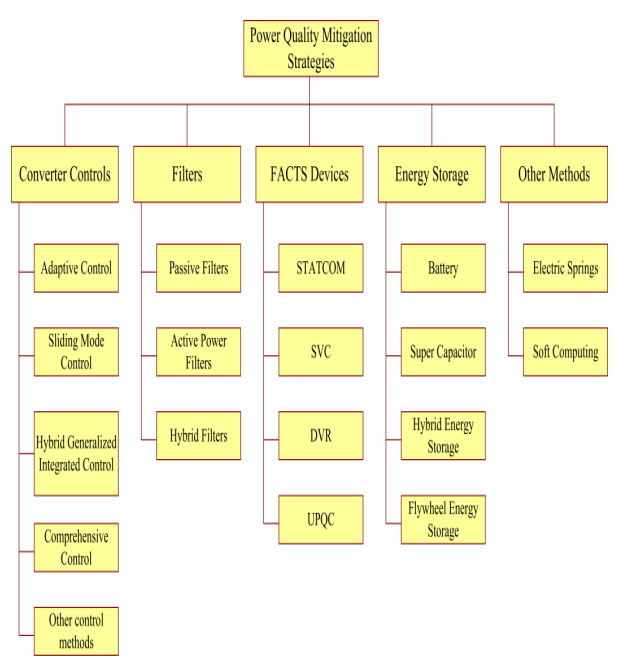 Power Electronics Converters are known to be the heart of the REs; these devices are responsible for injecting harmonics into the system. Various advanced methods of controlling inverters of RE systems for harmonic suppression are presented in [18]. The improvement of power quality with the use of filters or auxiliary equipment was suggested in [19] for hybrid PV/wind power plants. PQ issues namely power oscillations, harmonics, power factor, and voltage imbalances are significantly improved by FACTS controllers in highly RE perforated systems [20]. The power quality is improved by using a variety of energy storage devices, particularly for the purpose of power smoothing in RE systems discussed in [21, 22]. These include batteries, supercapacitors, and flywheel energy storage. Additionally, various techniques such as electric springs [23], soft computing-based approaches [24], and modular multilevel converters (MMC) are used in refining the power quality of RE systems [25]. The summary of the different strategies discussed in this section for improving the power quality of the system are as shown in Fig.2 below.