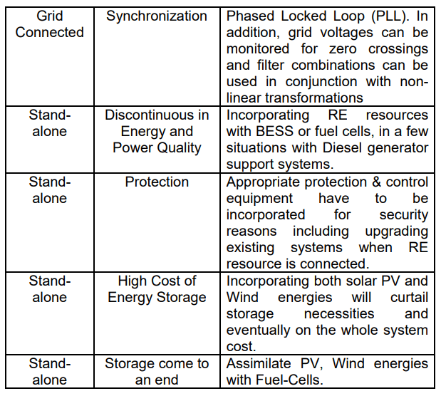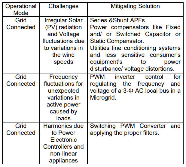 Now-a-days, some progressive technologies and techniques are being used continuously to develop and address the power quality challenges and their mitigation brought about by the incorporation of renewable energy in a microgrid [10]. Table 1. outlines the foremost challenges faced by grid-connected and islanded microgrid systems along with feasible remedies or mitigations.