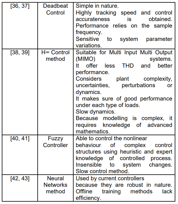 Table 2. lists some of the different features of distinct controller’s methods. Hence, from the above discussion it can be found that PI controller, Hysteresis Current control and Fuzzy method controllers are extensively used as the power converter controller strategies. Although, many deliberations are made in the studies on control methodologies in improving power quality of the microgrid systems, no single control technique can solve all power quality problems simultaneously. Therefore, future research will capable of focusing on the development of control techniques that meet the requirements and highly dependent on proper system modelling with the application of advanced control strategies such as optimization techniques [44, 45, 46] applied to the microgrid system controller design.
