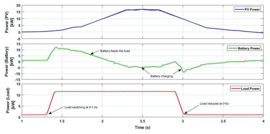 The PV generated power for various irradiance values, the corresponding response of the battery and load power is shown in Fig.10. At t=1s, the total load is fed by the battery as there is no generation by the PV module. At t=1.4s, load switching is done and load power is increased. The battery starts delivering more power to the load, while PV also starts generating power. Battery continues to feed the load along with the PV till the generated PV power becomes equal to the required load power. At t=2.2s, battery stops feeding the load, rather it starts charging by the excess amount of power generated by the PV. At t=2.7s PV power starts decreasing, so battery starts feeding the load. At t=2.9s, PV is capable of generating the power required by the load and starts charging the battery with the excess amount of power generated. At t=3s the load is switched to 0, the battery continues to get charged till the PV stops generating power. Thus the battery supports the PV generation by discharging and charges itself when the generation is in excess. The energy management works well for standalone mode of operation.