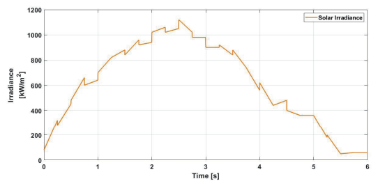 The BESS may also play an important role in grid connected mode of operation, which is smoothing of output PV power by balancing the sharp variation in the PV generation. The solar generation is fluctuating or intermittent in nature and may vary with respect to change in the irradiance pattern. A moving average filter is employed for power smoothing purpose and to obtain the power value which must be supported by the BESS. Fig.12 shows the irradiance pattern received the solar module. The respective smoothing of power is done using BESS as shown in Fig.13.