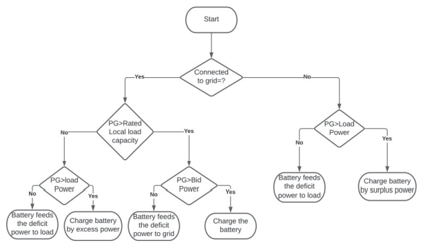 The proposed energy management system coordinates with the renewable energy generation, BESS, local load and power grid. It assumes that every individual plant has some onsite local load. Thus, the generating station is responsible for feeding the local load. This is done by feeding the load either from generation done by RES or if not available then the load will be fed by the battery. Thus, the generating plant has three functions (i) feeding the local load (ii) charging of BESS and (iii) selling surplus power to the grid. The energy management scheme considers the generation which is equal to the total local load rated capacity, as the power either used for feeding the load or if the load is less the its peak value then the rest of the power is utilised for charging the battery. Thus, whatever power is more than the rated local load capacity is considered as surplus power which may be sold to grid. An operator bids the power to be supplied to the grid on the basis of either predictions based on weather conditions or old trend of the generation. Its not necessary that the generation matches the bid power. Sometimes the generation may be higher and sometimes it be lower than the total generation. When the generation is higher than the bid power that power may also be used for charging of BESS, however, when the power is less than the bid power the battery is utilised to match the bid power. This, helps in maintaining the surety of power being promised by an operator. The proposed scheme is presented in the flowchart shown in Fig.2. When the system is in standalone mode, the generated power is utilised to feed the load and remaining surplus power is utilised to charge the battery. In case, the generated power is less than the load power, the battery support to handle the deficit power by feeding the load.