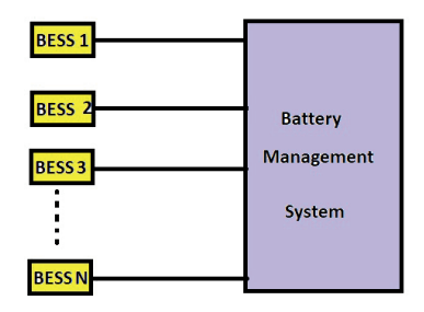 In this paper, a single unit of BESS and RES is implemented along with local load, which is in grid connected mode. Simulations are performed for standalone and grid connected mode both. The scheme is proposed for one such unit of microgrid, which may be easily extended for multiple microgird by using a battery energy management system as showin in Fig.3. Centralized BMS architecture has one central BMS in the BESS as hwon in Fig.3. All the battery packages are connected to the central BMS directly. The centralized BMS has some advantages. First, it is more compact. Second, the centralized BMS solution is the most economical since there is only one BMS. The main goal of BMS is to keep the battery within the safety operation region in terms of voltage, current, and temperature during the charge, the discharge, and in certain cases at open circuit. In this way, the battery will serve the application as long as possible in the most predictable way without creating any threat menacing the energy system and the nearby people (inhabitants, staff, maintenance, etc.). This part of BMS may be referred as charge and discharge management. Additionally, BMS may analyze the battery behavior in a continuous or periodic manner transforming the monitored parameters into battery state data which are fed to the upper system level or are directly used to control the charge and the discharge processes on a feedback principle. The upper system level can be the battery user itself (like a driver of an electric car) or a software/hardware configuration controlling the energy system. Depending on the obtained battery state data, the user can choose and execute a given decision which can be reduced often to a simple termination or restart of the charge or the discharge process.