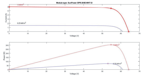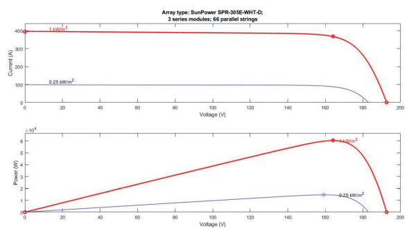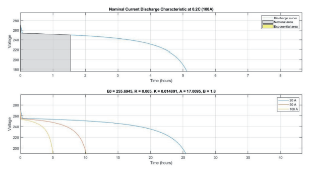 A small hybrid test microgrid is stimulated using MATLAB simulink platform, the test system model is shown in Fig. 4. The microgrid is composed of a 60 kW PV source using inbuilt 60kW Pv array SunPower SPR-305E-WHT-D module with 3 series module and 66 parallel strings. The solar PV characteristics for on module is shown in Fig. 5 and that for PV array having with 3 series module and 66 parallel strings is shown in Fig. 6. This PV module is connected to DC bus via a boost converter. PV generation is maximised with the help of maximum power points tracking (MPPT) at particular voltage for different values of irradiance and temperature. Incremental conductance based MPPT is applied to maximise the output power of PV module for a set of temperature and irradiance. In this method, the desired maximum power point depends upon the instantaneous conductance and incremental conductance. It is the point where the two values. Thus, this method measures the two conductance and compares them to track the point of maximum power, so when the two become equal, the solar PV operates at maximum power point. The algorithm tries to maintain the same during the operation. This algorithm is based on the observation that at the maximum power point, change in power with respect to the change in voltage is equal to zero. Thus, this PV module is connected to 1kV dc bus, from where it is connected to grid with the help of a two level voltage source converter. The output of two level voltage source converter is fed to a 20kW three-phase dynamic AC onsite local load. The PV module is also supported by a 250V, 500Ah battery module having an initial state of charge (SoC) = 30, which is also connected to the DC bus through a current controlled bidirectional DC/DC converter. The bi-directional converter help in two way flow of power. The nominal current discharge characteristics of the battery module at 0.2degC for a current of 20A, 50A and 100A is shown in Fig.7.