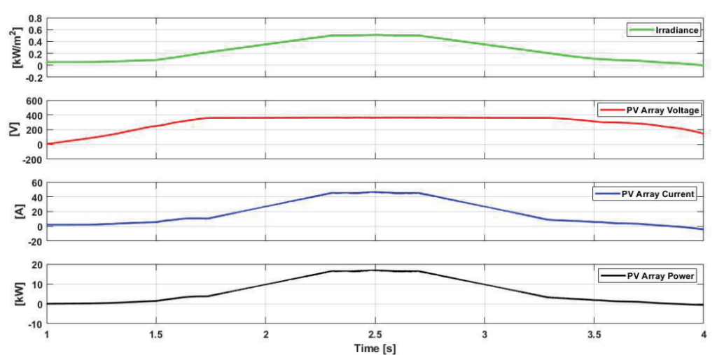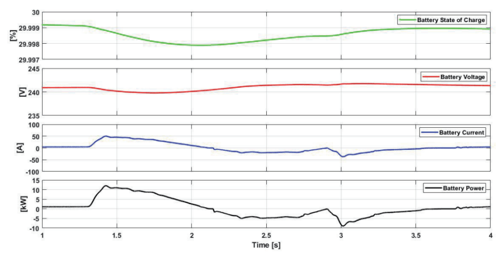 At t= 1.5s, irradiance starts increasing, PV array current and PV power follows the same pattern as that of irradiance and hence, starts increasing. At t=2.5s, irradiance is highest and hence, the PV array current and the corresponding PV array power reaches their highest value with respect to the irradiance pattern. Irradiance values decreases after t=2.5s, which is followed by PV array current and PV array power, while the PV array voltage is found to be almost constant at the output of PV module. The output of the battery module is shown in 9, depicts the state of charge (SOC), voltage, current and power of the battery, respectively. Initially at t=1s, battery current and power are zero, so a constant voltage is maintained while the SOC of battery is 29.999 percent. Now, at t=1.3s, load is switched on while PV power is zero, battery starts feeding the load. So, the battery current and power starts increasing while its state of charge and voltage starts decreasing. At t=2s, PV generates power almost equal to the load power, so there is no need for the battery to serve the load. Hence, the battery current and power becomes zero while the SOC and voltage of battery becomes constant. Now, after 2.1s, the excess amount of power generated by PV is used to charge the battery, hence the battery current and power increases in the negative direction (showing charging of battery) while SOC of the battery starts increasing and voltage is maintained at the initial voltage level. Again, at t=2.9s, the load is switched off, the battery gets more power to get charged which is shown by further increase in the battery current and power in the negative direction and the SOC of the battery in positive direction while the battery voltage is maintained at a constant value. Now when the PV power becomes zero, battery current and power are brought back to zero while SOC of the battery and its voltage are constant.