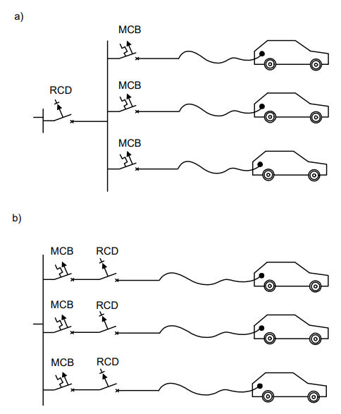 In accordance with the provisions of the PN-HD 60364- 7-722 standard [8], each connecting point of an electric vehicle should be individually protected with an RCD having a rated residual operating current not exceeding 30 mA. It follows that one RCD should not protect two or more circuits intended for EVs charging. If the RCD protects more than one circuit (Fig. 1a), then in the event of an earth fault in any of the final circuits, it is most likely that the RCD will trip and de-energize all final circuits. In the case of the solution presented in Fig. 1b, each circuit is equipped with an RCD. An earth fault on a given circuit will trip the RCD in the faulty circuit and will not interrupt power to EVs connected to other circuits. The application of a separate RCD per each circuit has yet another justification. In the case of a significant value of leakage currents appearing during the charging (several vehicles being charged at the same time), unnecessary tripping of the RCD collectively protecting several circuits could occur. If the solution from Fig. 1b is used, the probability of a large resultant leakage current is lower (only one charged EV per RCD).
