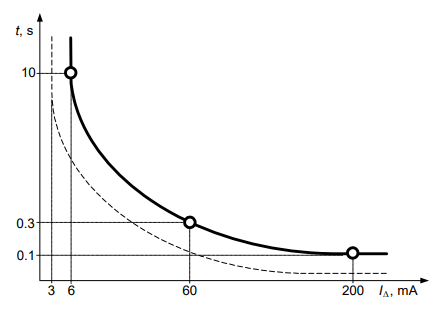 The given rated value of IΔdc = 6 mA is related to the DC operating characteristics presented in Fig. 2. The standard [14] specifies the maximum permissible break time for the following three points: 6 mA, 60 mA and 200 mA. For rated residual operating current (6 mA) it is 10 s.