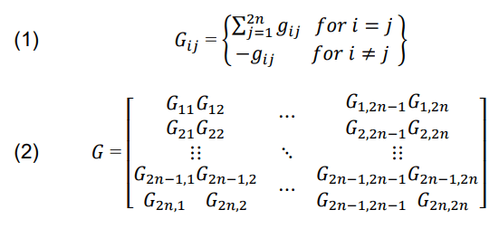 The microgrid DC network system has several clusters, where each cluster has several nanogrids, as shown in Fig. 2. The interconnection resistance between two nanogrids models the feeder resistance. The ring interconnections between nanogrids are illustrated in Fig. 2. Interconnection ring that uses an additional conductor layer (dashed line) is also shown in figure 2, so that this interconnection can connect feeders at the edge of the interconnection network in a circular manner. Thus, higher efficiency and increased reliability can be achieved by adding additional conductors, even in low-voltage distribution networks. The conductance matrix G can be constructed using feeder resistance values depending on the connectivity scheme and topological topology of a cluster. G is of the order 2n x 2n for a cluster with n nanogrids since there are two buses per nanogrid: internal bus and eksternal bus. Thus, members of the conductance matrices Gij and G can be represented in terms of individual conductance gij between any two buses i and j, where i might range between 1 and 2n: