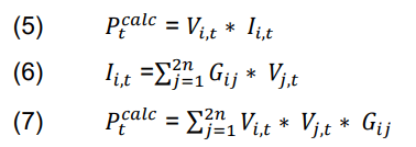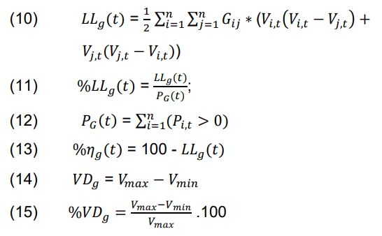 ∆𝑃i(k) represents the difference between the scheduled powers 𝑃isch and 𝑃ical on bus i at the kth iteration. The term ∆𝑉i,t in the matrix explains that there is a change in the voltage of the bus in each iteration. Then, the voltage on each bus is updated by adding 𝑉i,t and the voltage ∆𝑉i,t from the previous iteration until convergence is obtained. This convergence is the voltage value used to find the power losses LLg(t) and the percentage of power losses %LLg(t). Power losses and their percentages can be can be calculated mathematically as in the formula below.