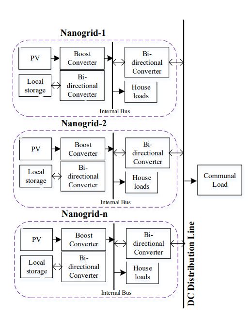 The proposed electrical architecture is a distributed generation and distributed storage (Fig. 1). Households are the basic building that represents a nanogrid. Each house is capable of generation, storage and bi-directional power flow. A combination of several nanogrids that can share resources can be defined as a DGDSA in a DC Microgrid network so that the balance of load power is fulfilled and even communal loads can also be supplied together.