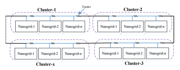 A remote area with 20 houses was utilized to test the proposed methodology. Each house has a maximum PV generation capacity of 250 WP at 1000 W/m2 radiation, battery with an energy capacity of 100 Ah. DC loads that can be operated include lighting, fans and charging. The village is divided into four clusters with five houses per cluster.