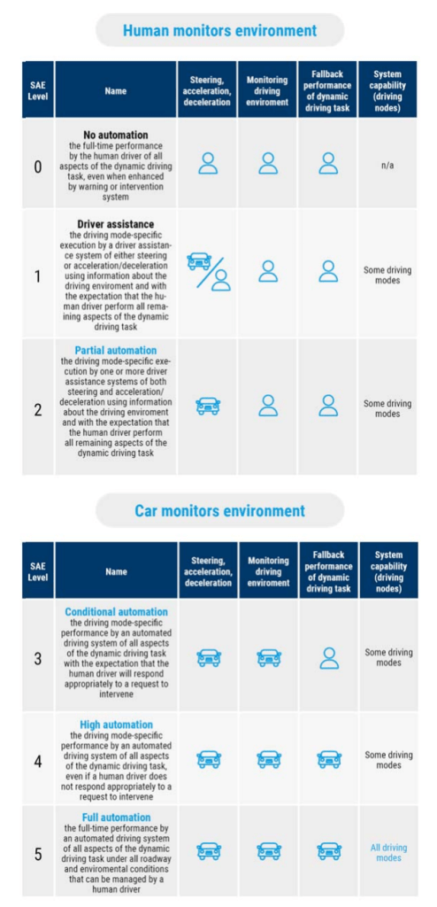 Blockchain technology is related to the security of storing and transmitting user data. Applies to transactions concluded on the Internet between users. We can say about blockchain technology that it consists of decentralized transaction registers, which are composed of a long chain of data blocks [1]. They are used to store and send data related to concluded transactions. The blockchain containing recorded data does not require the use of management systems, central computers and systems that verify operations. All transactions can take place without intermediaries and in almost real time. Similarly to issues related to blockchain, concepts such as electromobility, electric vehicle, autonomous vehicles, Smart Grid have been appearing in the area of economy for a long time and enjoy unflagging interest in scientific discourse, political debates and in the media. The development of this sector is strongly connected with social awareness, social and political changes [2]. Electromobility can be defined as all the issues related to the use of electric vehicles (EVs). As a branch of this issue, there is more and more talk about autonomous vehicles that are able to independently overcome designated routes, avoiding obstacles and performing other road tasks. Autonomous vehicles can be divided according to the function they perform into groups and levels proposed by SAE International (Society of Automotive Engineers), which determine what degree of human intervention is necessary to drive a given vehicle (Fig. 1.) [3].