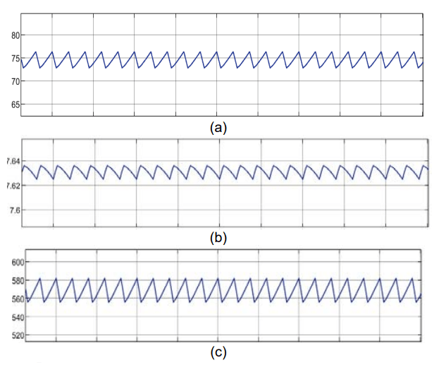 Figure 5 presents input parameters for the high voltage gain DC-DC converters powered by a solar panel with the following specifications: a) Voltage (Fig. 5a): The solar panel supplies 75V, determining the initial electrical potential for the converters. Solar system voltage varies based on solar irradiance and temperature. b) Current (Fig. 5b): The solar panel yields 7.6A, essential for calculating total electrical power generated. c) Power (Fig. 5c): The solar panel outputs 560W, indicating its capacity to generate electrical energy. These parameters are the initial energy source for the converters, responsible for stepping up input voltage for various applications.