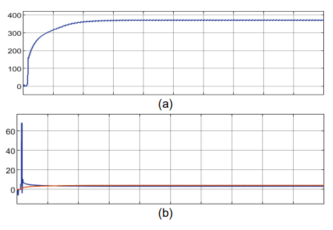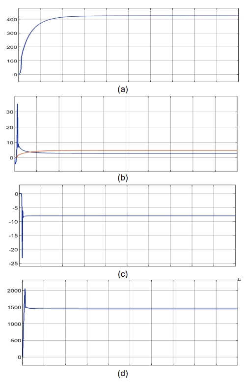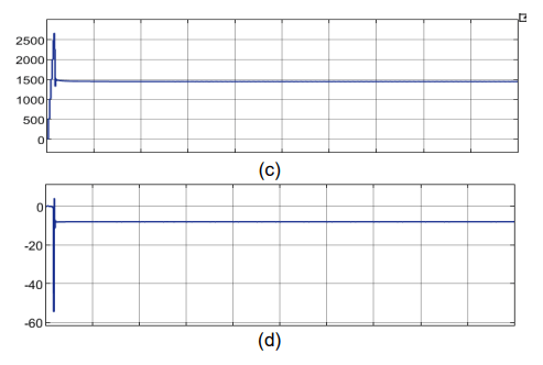 Figure 6 provides an overview of output parameters for the motor load connected to the high voltage gain DC-DC converter: a) Load Terminal Voltage (Fig. 6a): The voltage at the load terminal is 440V, crucial for the motor’s operation. b) Armature and Field Current (Fig. 6b): Armature current is 5A, field current is 0.9A, influencing the motor’s electromagnetic interactions and torque. c) Load Torque (Fig. 6c): The load torque is 8Nm, representing the rotational force required. d) Motor Speed (Fig. 6d): The motor operates at 1400rpm, a critical aspect of motor performance.