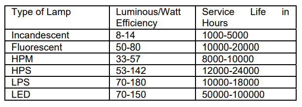 Table 2. Light technology comparison based on luminous efficiency and lamp service life