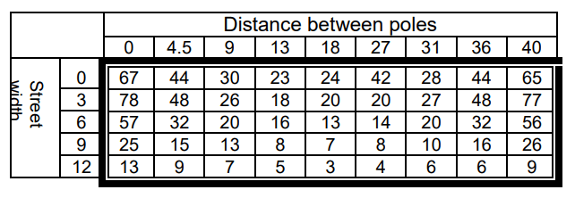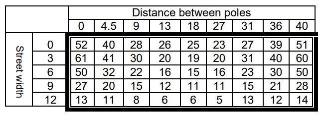 Measurements were repeated for the same values except for the height of the pole which becomes 12 meters. Table 4 presents the illuminance of lighting units for street lighting using HPS lamps of 250 W with pole height of 12 meters, boom length of 3 meters, and boom angle of 5 degrees.