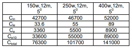 The operational costs (Cin), (Cle), (Ce), (Ce10), and (Ctotal), are shown in Table 6 for different levels of HPS powers; namely at 12-meter pole height, a boom angle of 5 degrees, 150W, 250W, and 400W.