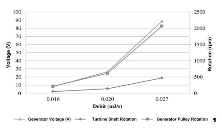 Figure 1 illustrates the relationship among generator pulley rotation, turbine shaft rotation, and generator voltage. As the discharge of the turbine increases, both turbine shaft rotation and generator pulley rotation similarly increase, resulting in elevated generator voltage values. Notably, at the lowest discharge condition of 0.027 m³/s, the turbine shaft rotation achieves its peak at 468.97 rpm, and the generator pulley rotation reaches 215.82 rpm. Conversely, the highest discharge condition of 0.016 m³/s corresponds to the lowest values, with turbine shaft rotation at 49.39 rpm and generator pulley rotation at 2068.225 rpm. This data demonstrates a direct impact of discharge amount on the rotation of the turbine shaft and generator pulley. The influence stems from the water pressure on the rotation of both components. Specifically, a higher water discharge into the turbine results in accelerated turbine rotation. This acceleration is reflected in a threefold increase in generator pulley rotation, ultimately leading to a substantial voltage output.