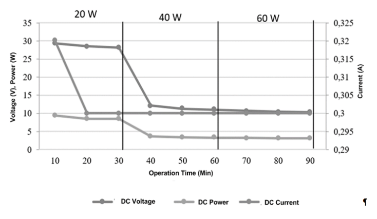In Figure 2, the relationship between voltage and current concerning the lamp load is depicted, revealing an inverse proportionality as the lamp load increases. The highest recorded values are 29.3 Volts for voltage, 0.32 A for current, and 9.38 W for power, observed at a lamp load of 20 W. Conversely, the lowest values are 10.3 Volts for voltage, 0.3 A for current, and 3.09 W for power, occurring with a lamp load of 60 W. Observing the graph, it’s evident that voltage, current, and power undergo fluctuations in response to changes in the lamp load. These fluctuations are influenced by variations in water discharge, although efforts are made to maintain a constant water discharge during the data collection time interval.