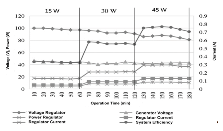 In Figure 3, the relationship between voltage and current in response to the AC lamp load is depicted, revealing an inverse proportionality as the lamp load increases. The highest generator voltage is recorded at 46.6 V, with the lowest generator current at 0.128 A. Simultaneously, the regulator exhibits its highest voltage at 100 V, the lowest regulator current at 0.05 A, and the lowest power at 4.85 W, all occurring with a light load of 15 W. Conversely, the lowest generator voltage is 39.3 V, with the highest generator current at 0.297 A. The regulator’s lowest voltage is 81 V, with the highest regulator current at 0.13 A and the highest power at 11.44 W, observed with a light load of 45 W. The system efficiency reaches its peak at 0.77% for a 45 W lamp load, while the lowest efficiency is 0.33% for a 15 W lamp load. The graph illustrates fluctuations in voltage, current, and power in response to changes in the lamp load. These fluctuations are influenced by variations in water discharge, although efforts are made to maintain a constant discharge during the data collection interval.